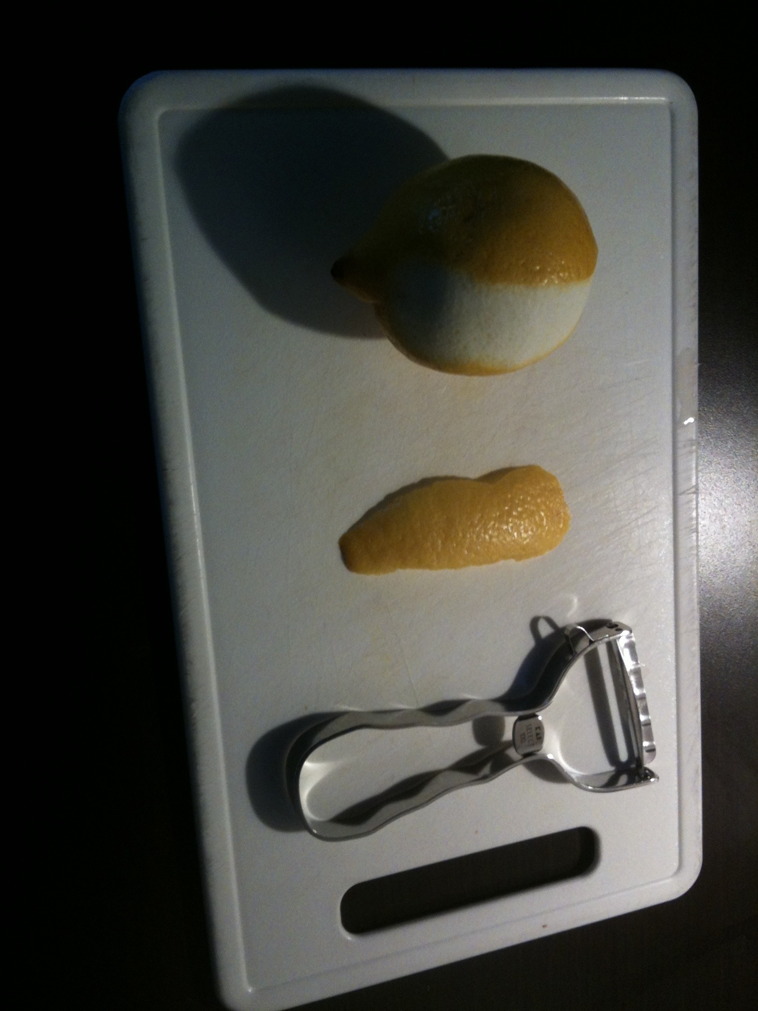 Take a normal peeler and skim off a strip of jlemon peel. With the yellow waxy side (not the white pith side) facing down, twist and squeeze the peel over the glass so that little miniature explosions of lemon oil burst out and spray the inside of the glass. I also rub the peel around the glass to transfer as much of the oil as possible.