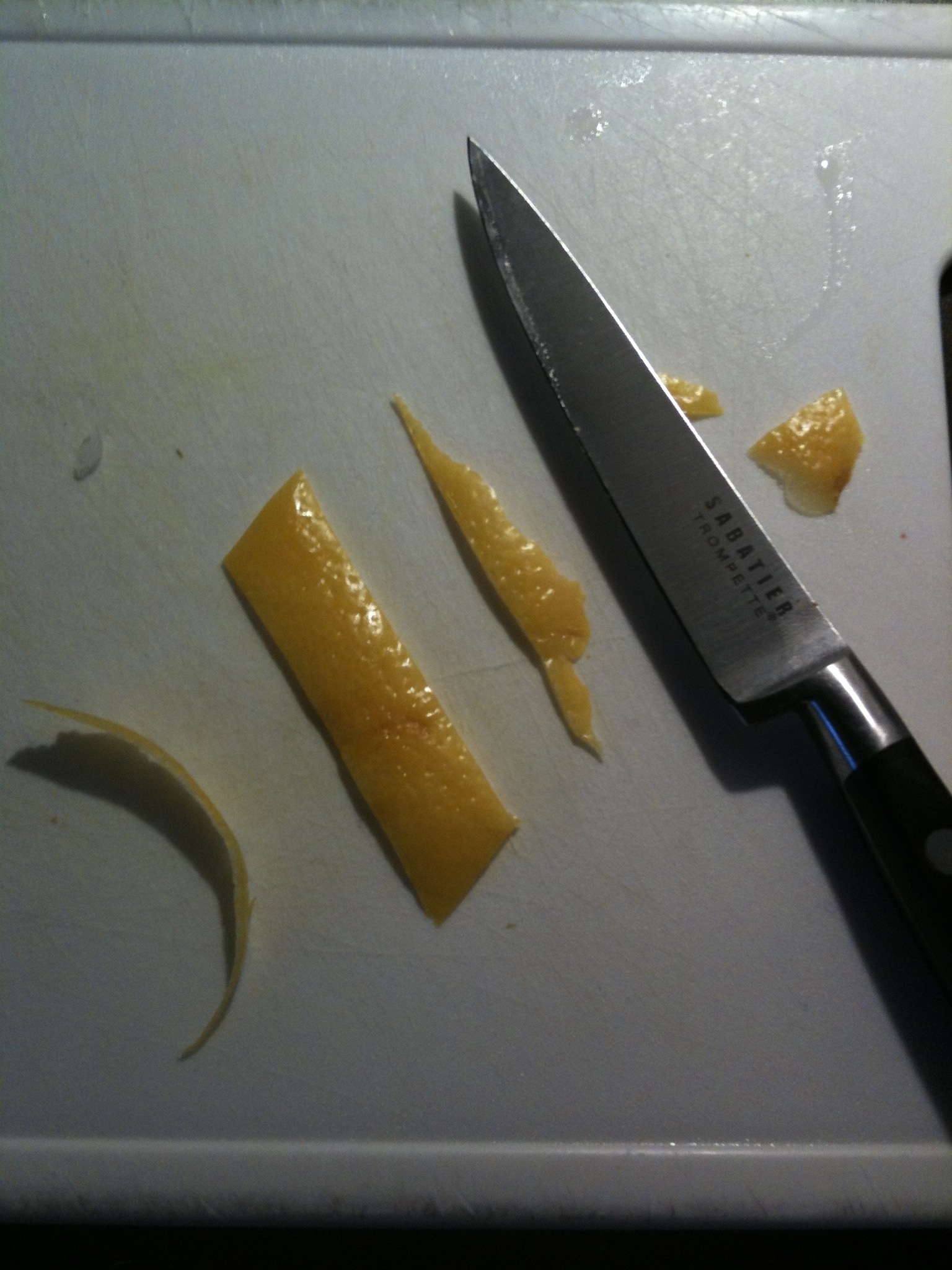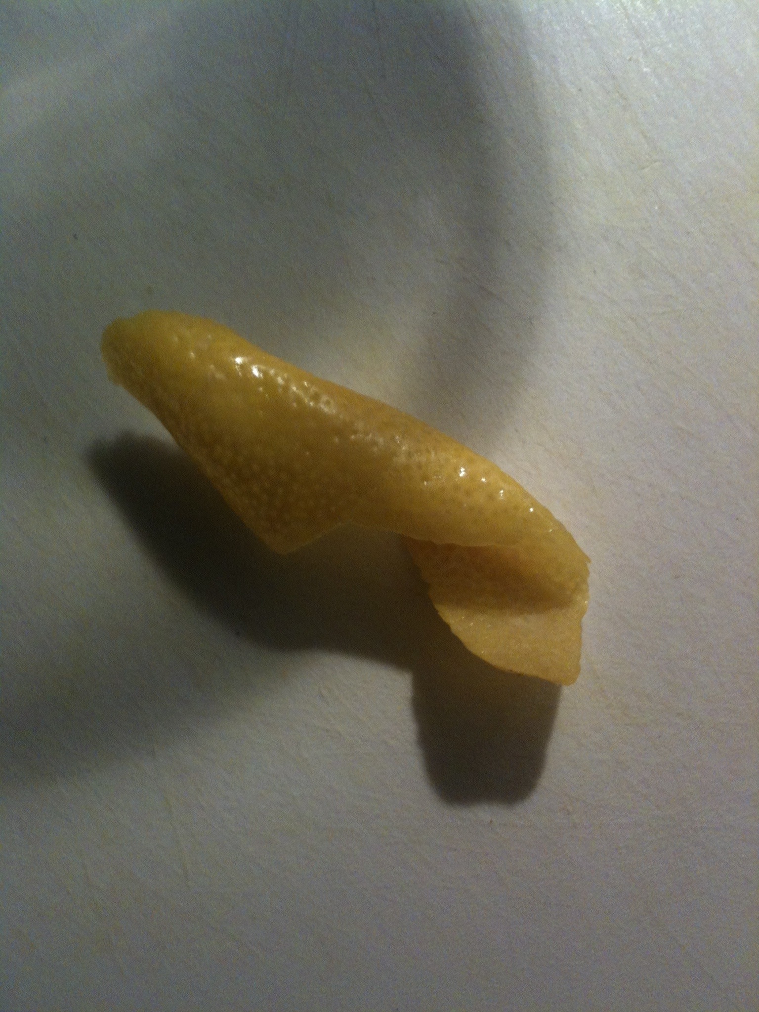 You could serve the lemon peel as the martini garnish as it is although I like to shape it quickly with a knife. Nothing fancy, just making the slightly ragged ends more neat.
