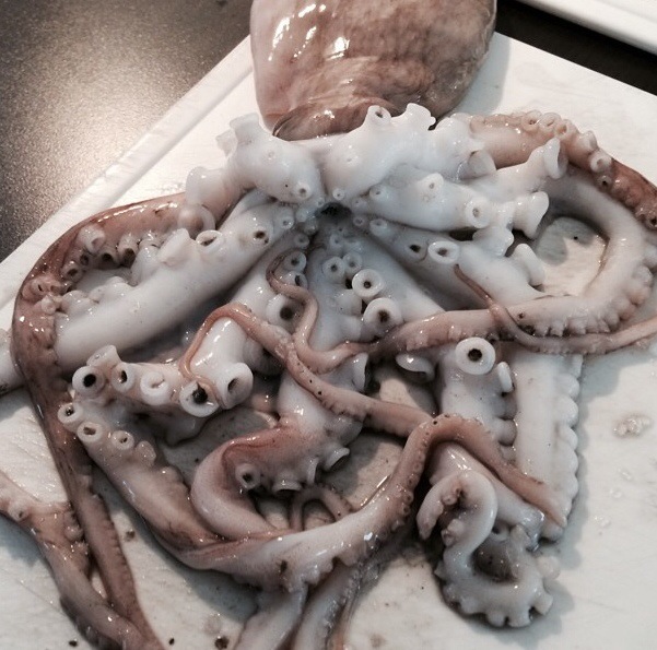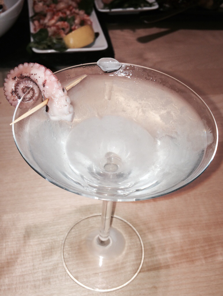 For a seafood theme I made a slight alteration to a classic gin martini, adding a dash of olive brine for a sea salty hint. Real salty sea dogs might want to make it a full blown dirty martini for that briny flavour. I also garnished the glass with some octopus tentacles I boiled and chilled earlier.