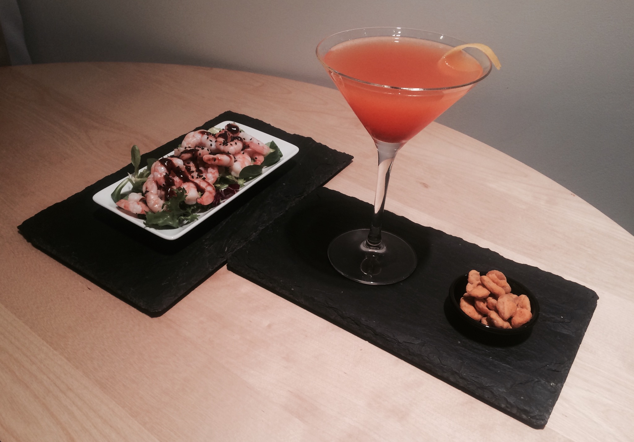 As far as accompaniments are concerned this martini goes very well with seafood. I would recommend chilled oysters, prawns or salmon as an accompaniment, possibly even with avocado. I think the cool, oily/fatty fish compliments the fiery drink. Here I served chilled king prawns on a bed of lettuce with Peking duck sauce with sesame seeds. I’m sure there are more sophisticated accompaniments than something I poured out from a jar but I just got home from work and wasn’t intent on doing anything more fancy. I also served some spicy broad beans as well.
