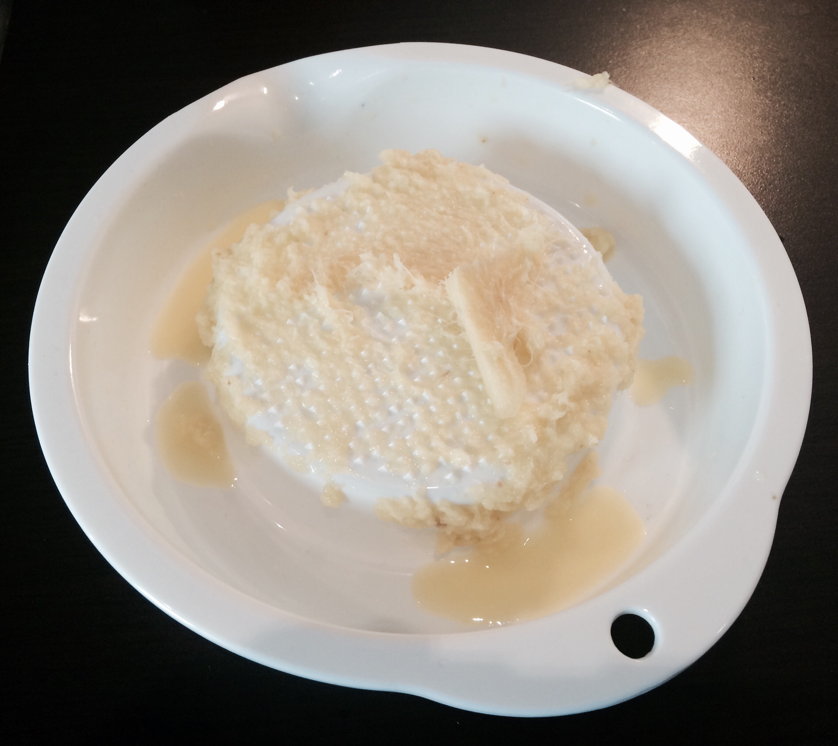 Use a Japanese grater (one of my favourite kitchen utensils) and grate the peeled ginger to release all the juice. Squeeze out then discard the fibrous pulp.