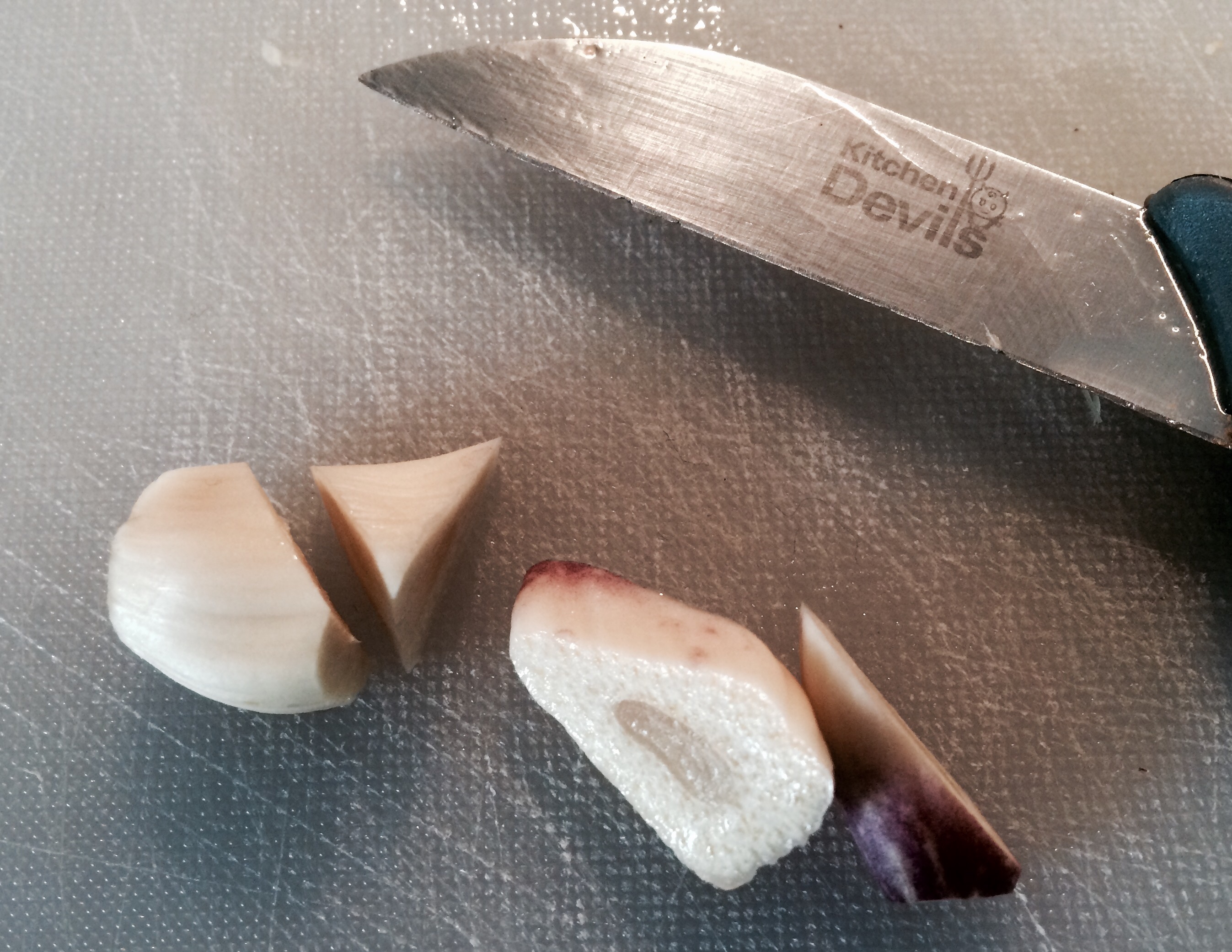 Peel then coarsely cut a single clove of garlic. Add the pieces to the cup.