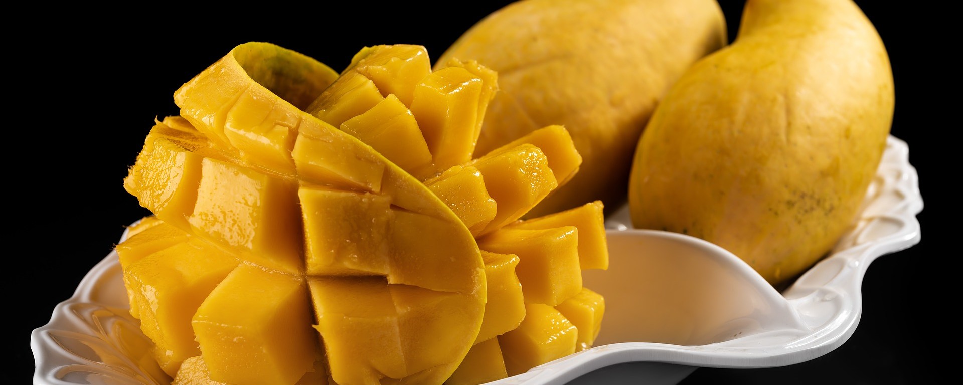 Take a fresh mango and slice off an end, cutting it as close to the stone as possible. Use a blunt knife to cut the flesh of the cut side into cross-crossed squares but be sure not to cut through the skin of the fruit.