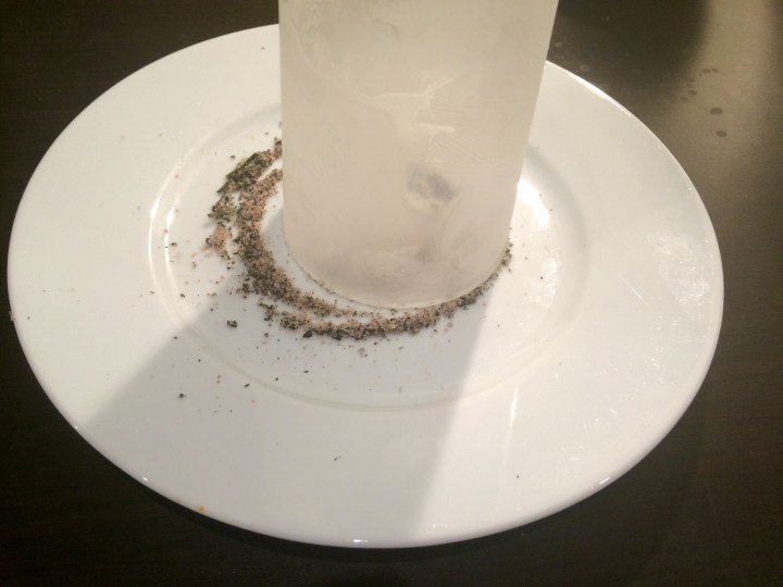 Rim the glass with the ground mixture. Save any leftover mixture for later. You will need the lime/yuzu as well.