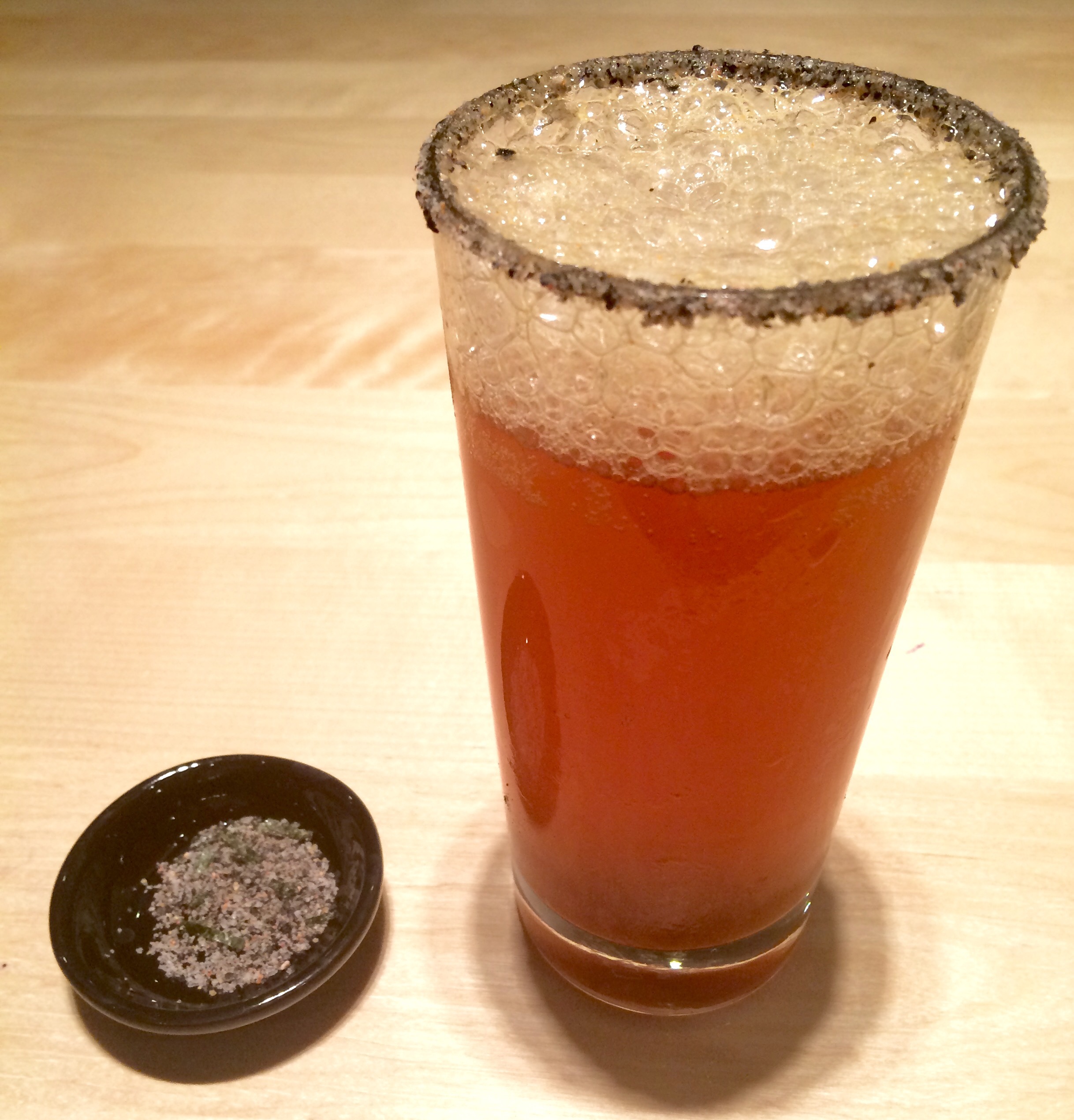 It’s very similar to a standard Mexican Michelada, which is essentially beer, lime juice and some additional savoury and/or spicy sauces served in a salt-rimmed glass. The drink is comparable to a Bloody Mary and very good for a hangover or alcoholic rehydration on a hot day. However, the mixture for the glass rim in my version is heavily influenced by Japanese ingredients. If you can’t get hold of them, I recommend you try a more standard recipe with beer, Worcestershire sauce, lime and salt at the very least, so you can experience this wonderful drink. The ingredient combination might sound unusual, alien and even unpalatable to some of you but trust me, I’ve had lots of experience.