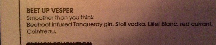 It consisted of Tanqueray gin infused with beetroot (I am a fan of savoury infused spirits), as well as vodka, Cointreau, Lillet blanc and a red current garnish. It was a far cry from my normal classic martini but I liked it nonetheless.