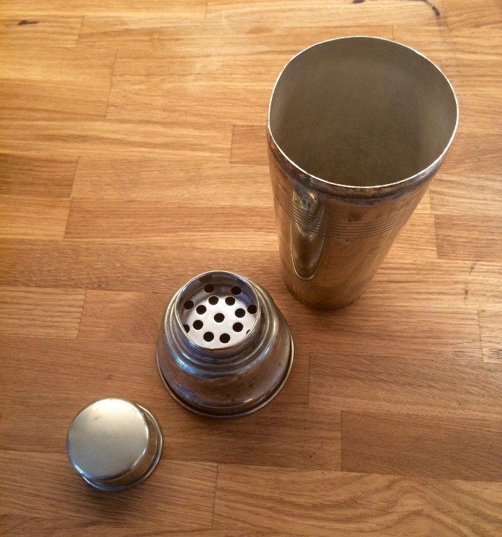 Taking a vintage silver-plated cocktail shaker, I added about 4 ice cubes and poured over the coffee. If you don’t have a cocktail shaker you can do this with a large jar. It works almost as well.