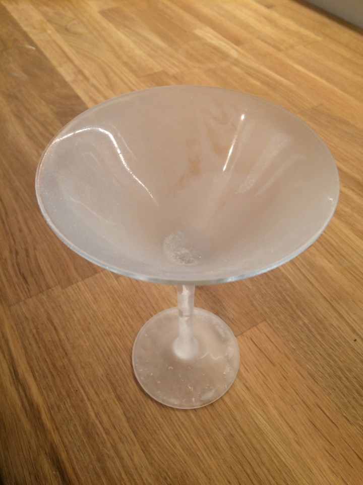 There – a nice and frosty martini glass. I’ve seen these served in coupe glasses as well which works nicely too.