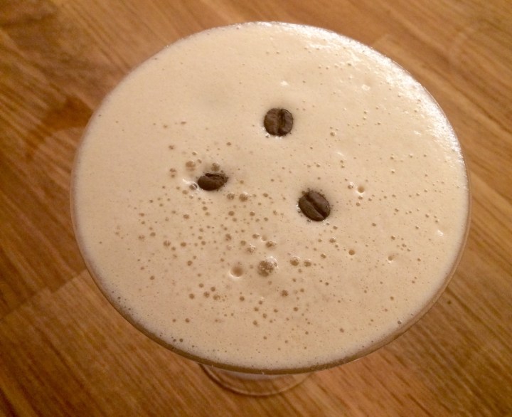 It should look thick, rich and creamy on top, with a dark dangerous looking underside. Garnish with some coffee beans.