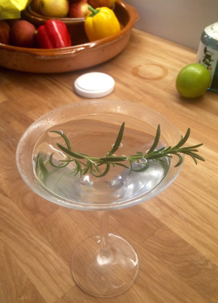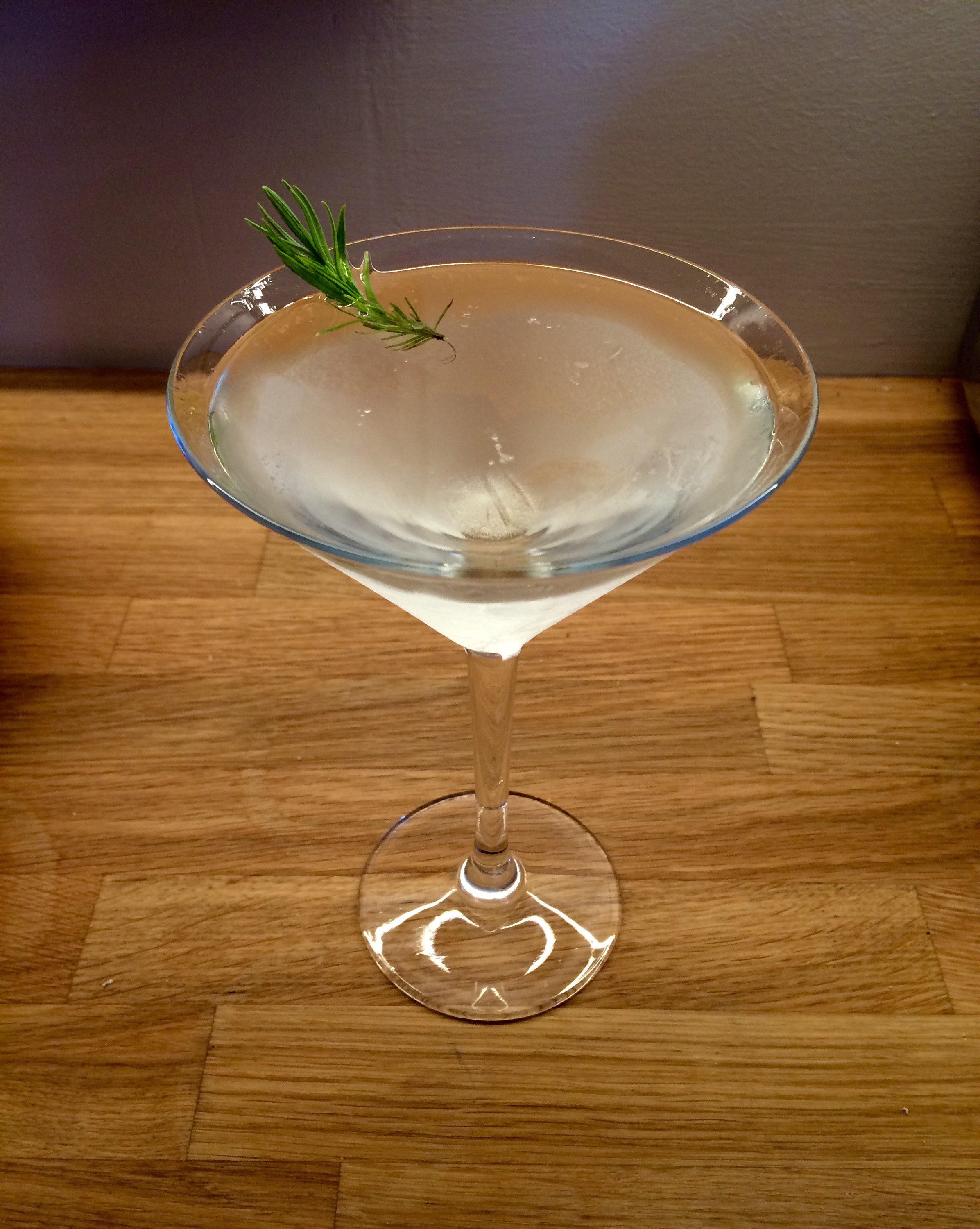 A martini garnished with rosemary. For a rosemary-infused martini see here.
