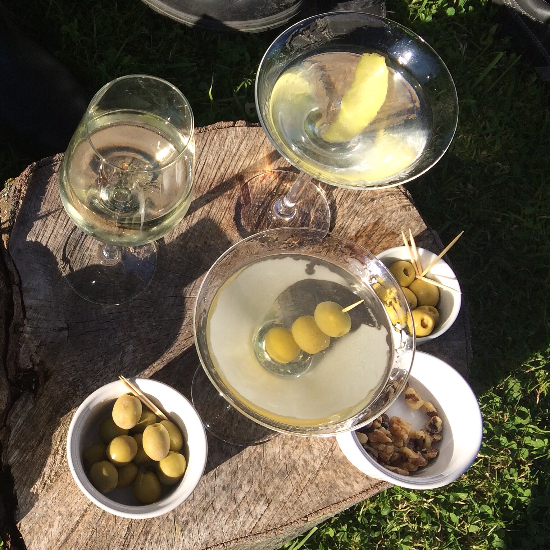 Martinis, wine, olives and walnuts on a tree stump in the garden on a summer’s evening.