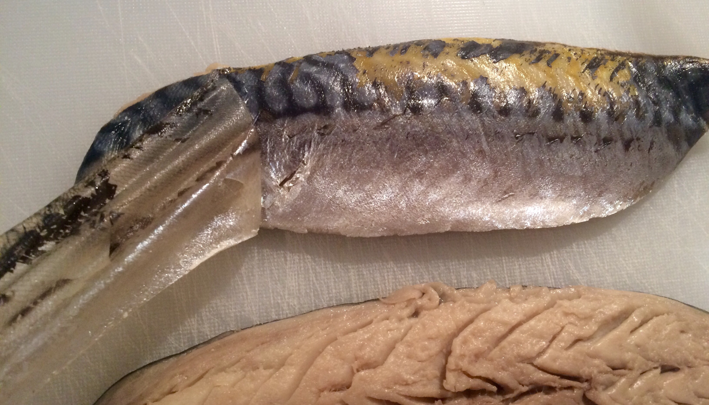 - Start at the top end of the fish and find yourself a bit of the skin to hold on to. It’s sort of like trying to peel back a new piece of sellotape.