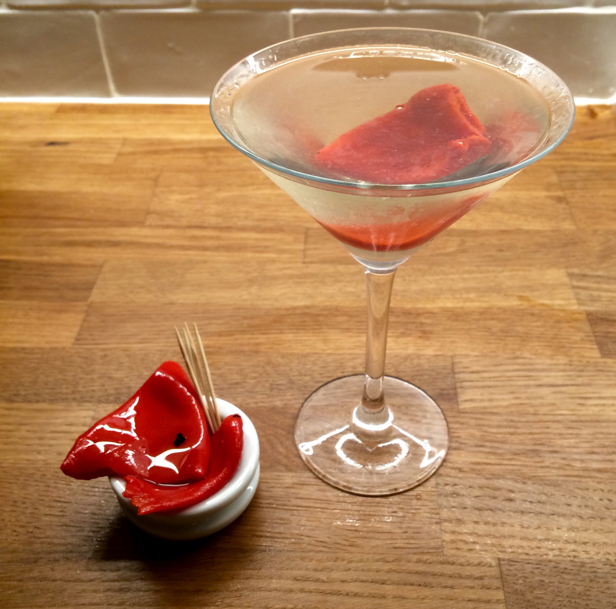 - Stir with one of the peppers and drop it in as a garnish.