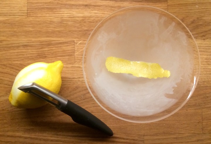 Take a chilled martini glass and squeeze a freshly peeled strip of lemon rind into it. Rub the peel around the inside of the glass to transfer as much of the lemon oil into it as possible. Keep the strip when finished.