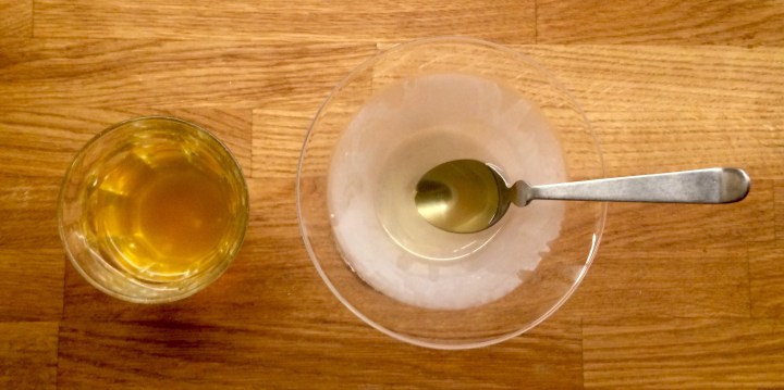 Add vermouth to taste (1tsp – 25ml) then top up with gin or vodka (100-120ml). Stir with the strip of lemon (then suck the lemon, just for the joy of it) before discarding it.