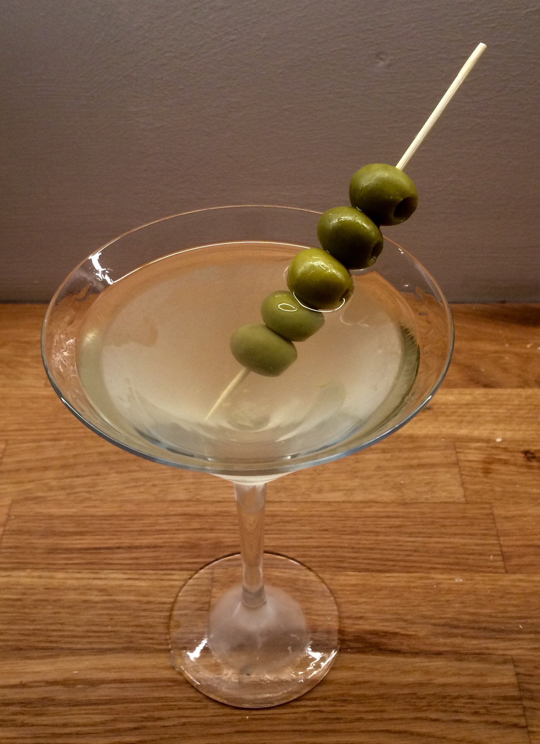 Take a bamboo skewer and thread on some olives. I think convention dictates that it should be an odd number of olives but it doesn’t make that much of a difference. If you only have toothpicks to hand just thread on one or two olives.