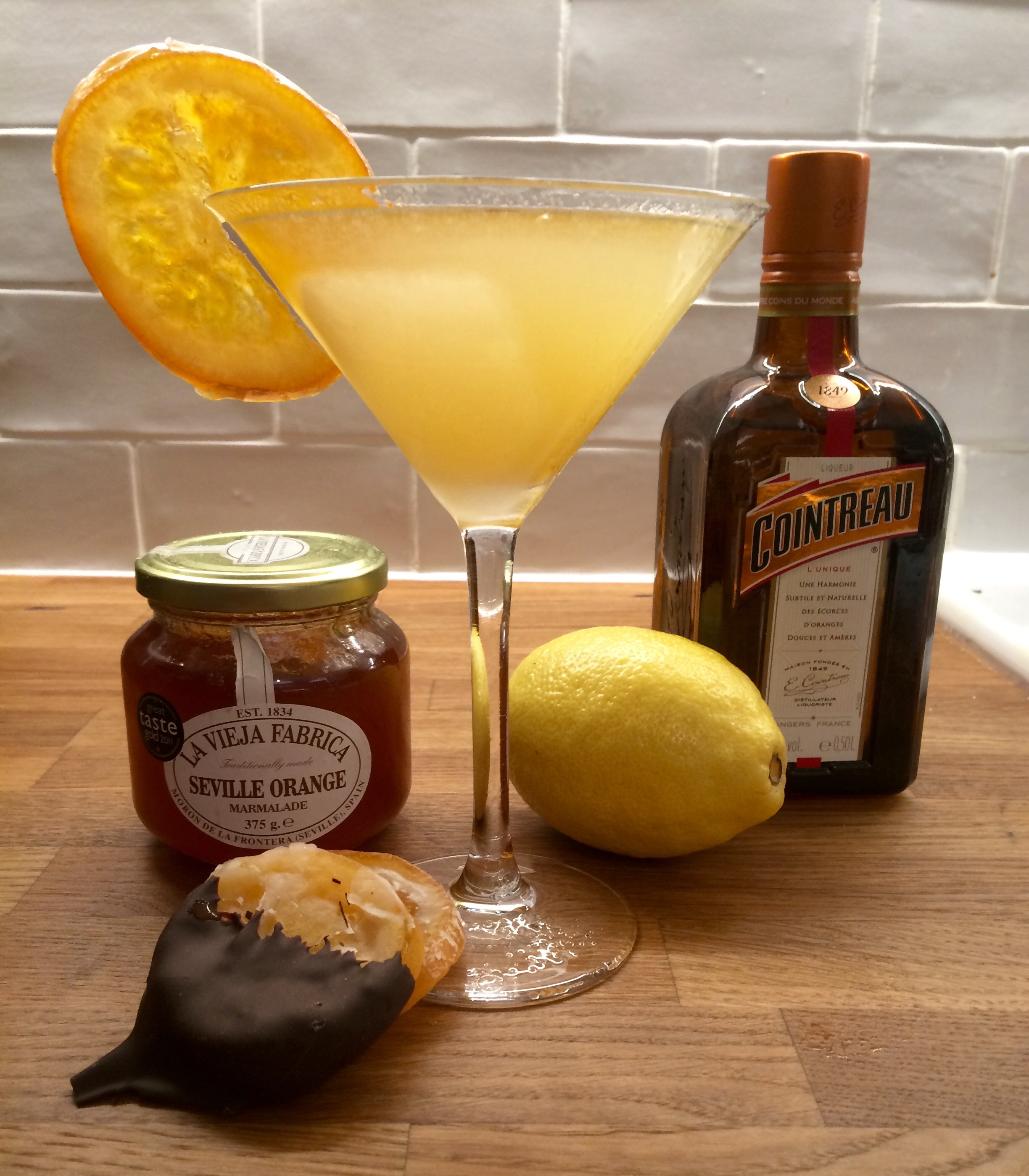 As a garnish, you can use a strip of orange peel dropped into the drink, a slice of fresh orange, or as I have opted for in this case, a whole crystallised/candied orange slice.