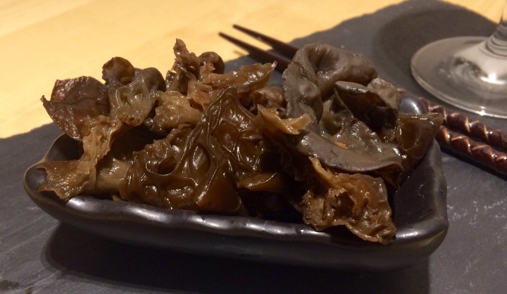 That soy-vinegar mixture works well with quite a lot of things. Here I used it as a dipping sauce for wood ear mushrooms. Buy these dried, bring a pan of water to the boil, throw them in, take the pan off the heat, give them a stir, leave them to soak in the water for 30 minutes, drain then serve.