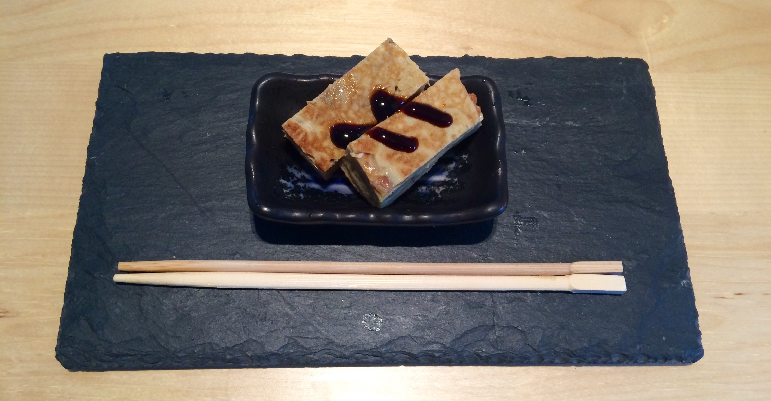 Here is some tamago-yaki (fried omelette) with a sweet balsamic vinegar glaze. This is also nice at breakfast by the way.