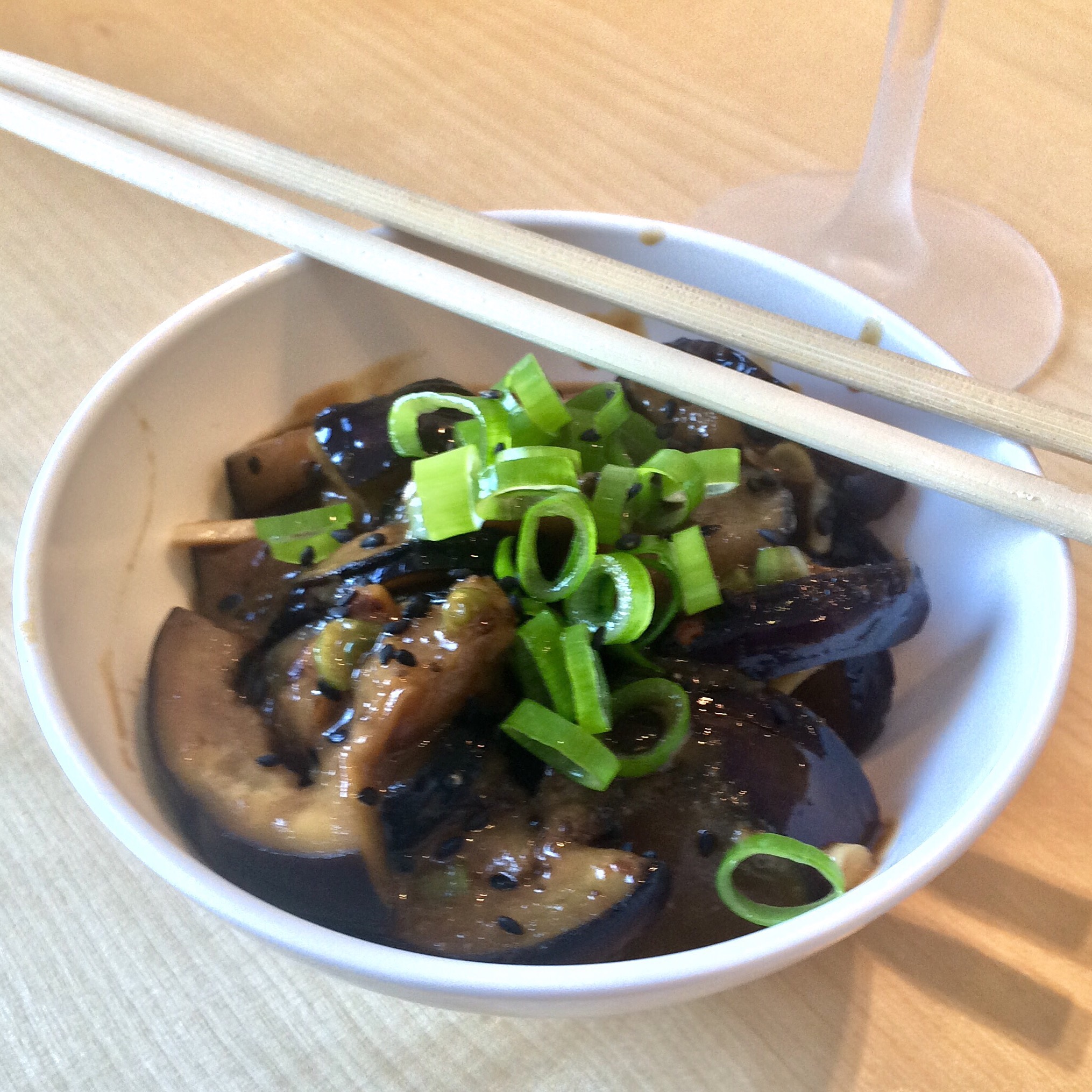 This is more authentically Izakaya. Sliced aubergine (egg plant, if you must) stir fried then combined with a light miso sauce, with chopped spring onions sprinkled on top. It can be served hot or cold.