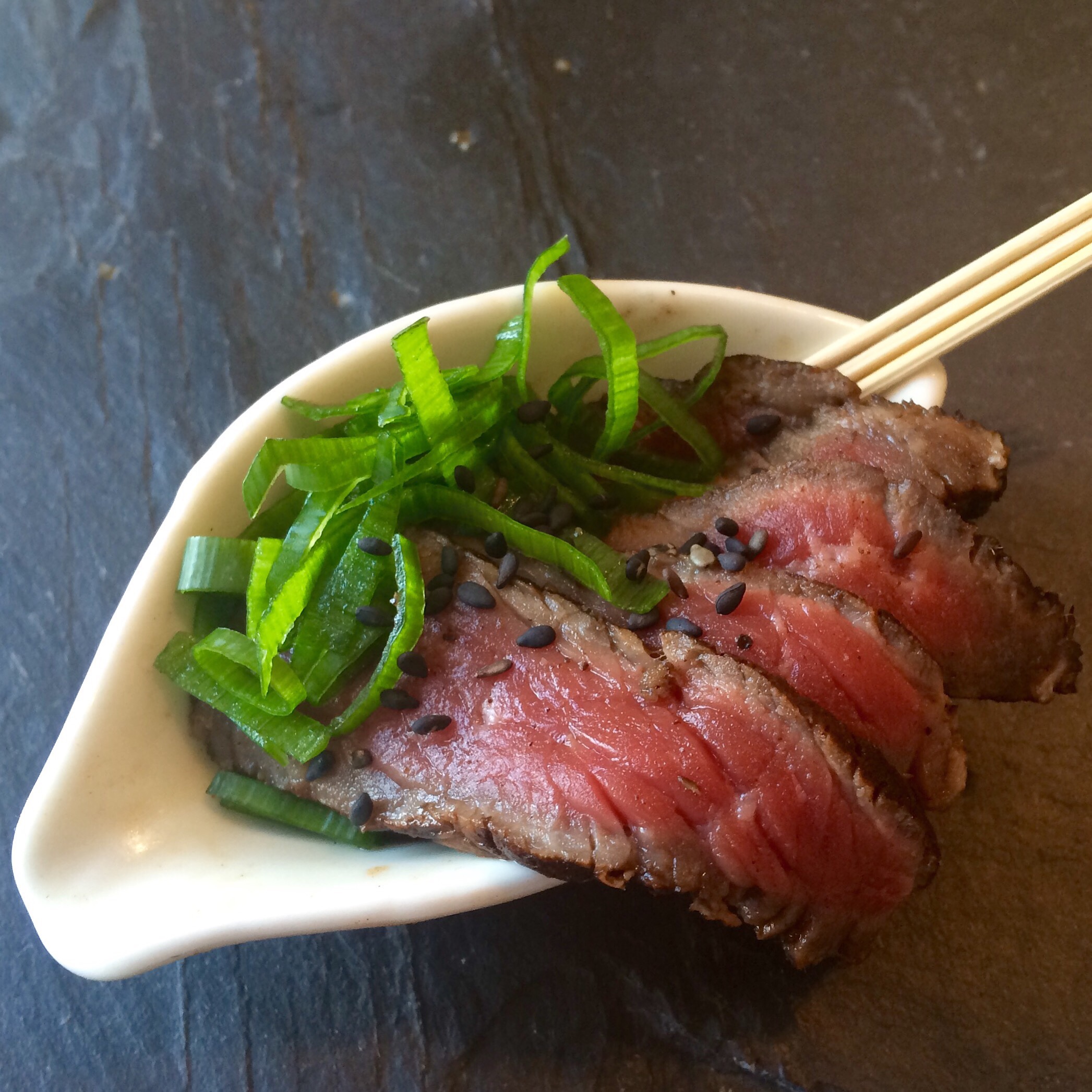This wasn’t cheating but it was a lot more time consuming. It’s some thinly sliced rare beef with spring onions. I rubbed the beef with salt and pepper, cooked it lightly in a pan, chilled it in iced water, patted it dry, sat it in a sweet soy and onion marinade overnight then sliced it thinly and served it with spring onion.