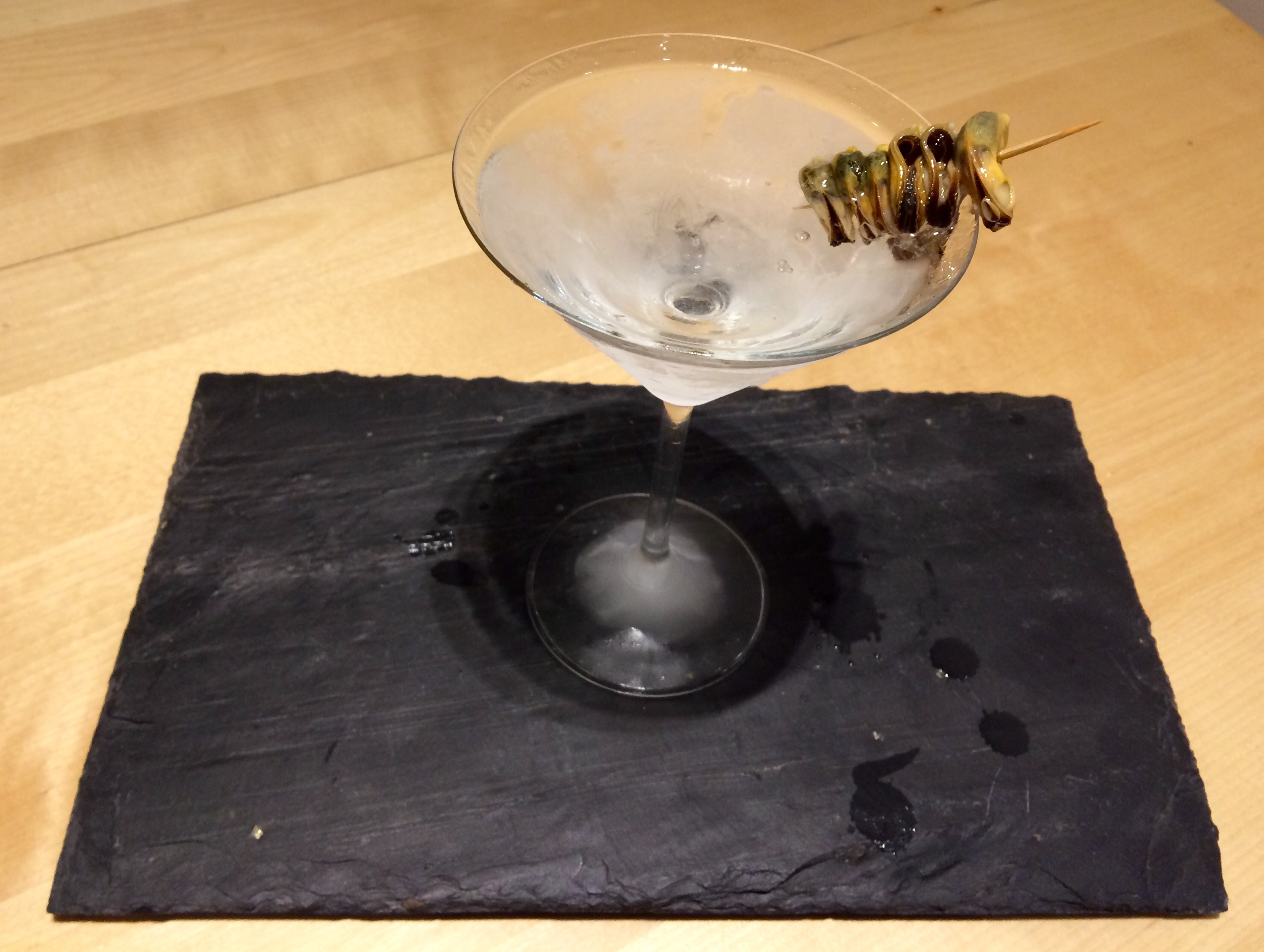 One of my friends complains about prawn sandwiches having a “high death-to-bite ratio” but this mussel martini has a “high death to sip ratio”… Much like those of James Bond’s… It’s not the most appetising garnish I ever made but life without experimentation is dull. I simply threaded some pre-cooked mussels on a toothpick and served it on the side of the glass.