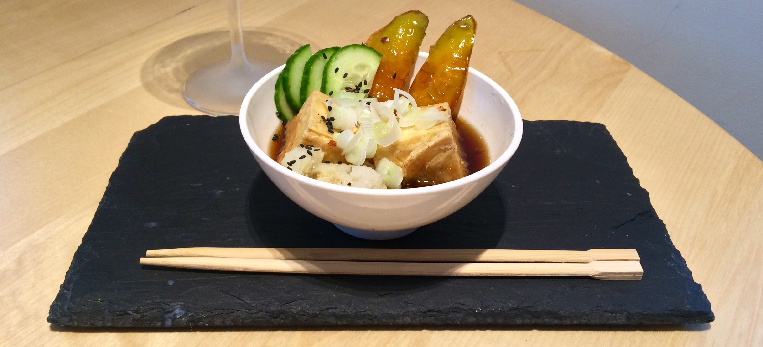 It’s deep-fried tofu cubes in simmered dashi stock. I made some here with fried peppers, grated daikon, sliced cucumber, sliced spring onions and sesame seeds. For a recipe I recommend my favourite online cookery show: Cooking With Dog.