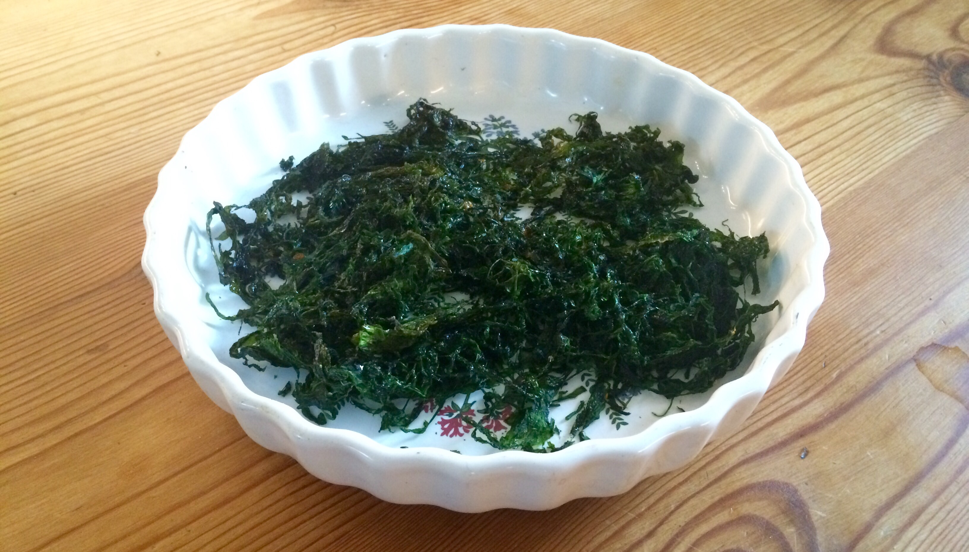 I then served it as a messy but tasty and savoury nibble to accompany the evening’s martinis. It tasted like the deep fried seaweed you often get in Chinese restaurants, except that it was actually made from seaweed and was roasted rather than fried.