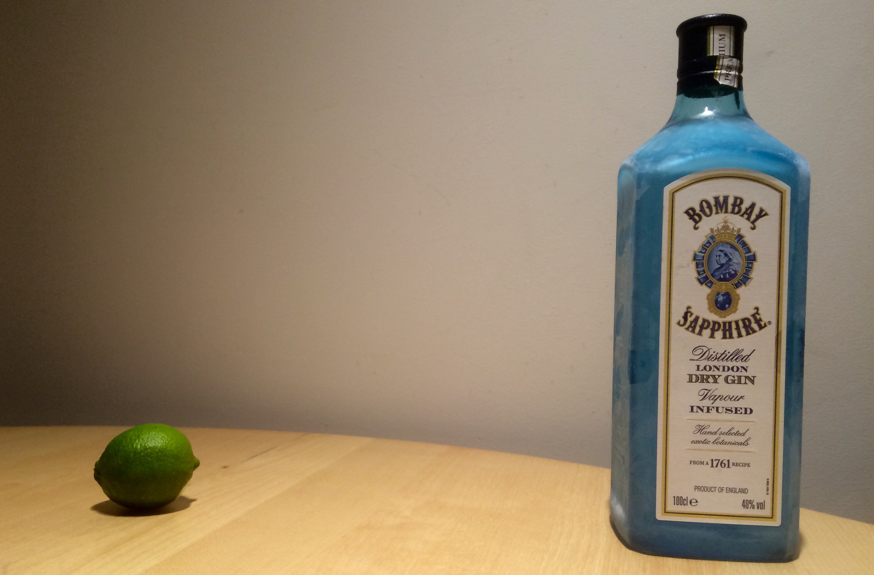 As chance would have it my flatmate brought back a bottle of Bombay Sapphire the very next day. Absolutely perfect for a bare-faced comparison test. As you can see, the branding is far more exuberant. The blue-coloured glass is iconic, while the black and gold detail is positively regal, enhanced not least by the image of HM Queen Victoria.