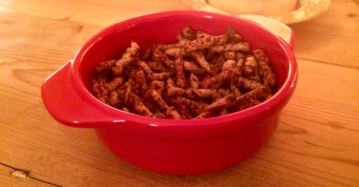 Simple, easy, light, savoury, Twiglets are an underrated canapé snack. They are the flavour and texture opposite of the martini. Where a martini is cold, smooth, heady, citrusy and ever so slightly sweet, these are light, crunchy, salty and savoury. They don’t look particularly elegant but the flavour contrast really works. They’re a guaranteed winner for marmite fans.