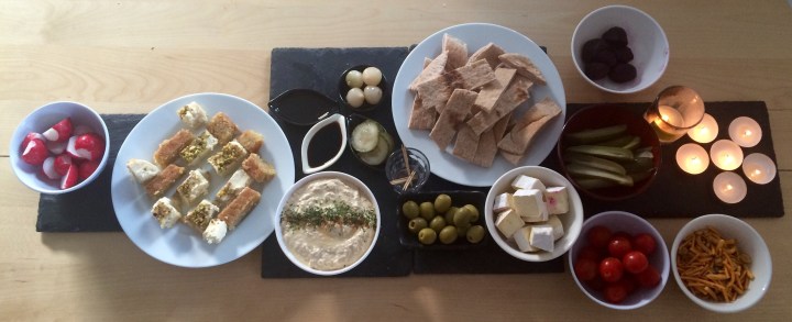 Here it is served with sliced pitta bread and a variety of mostly Mediterranean snacks.