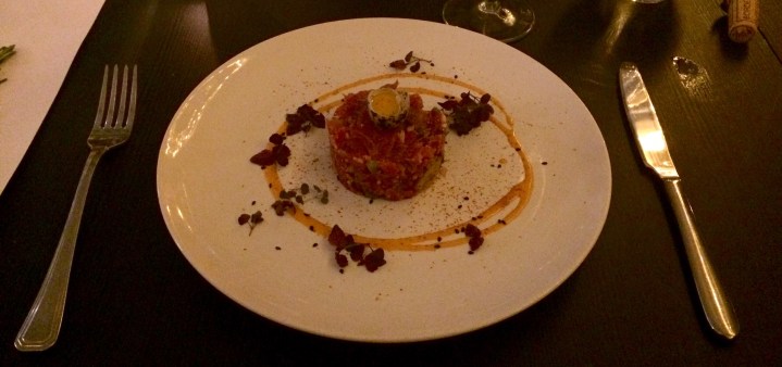 Next came a delicious steak tartare, with croutons, edamame, spicy sauce and a raw quail’s egg among other things.
