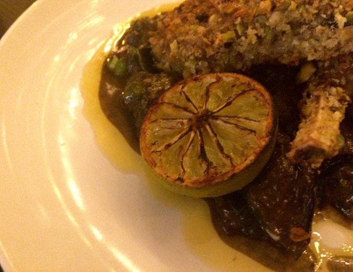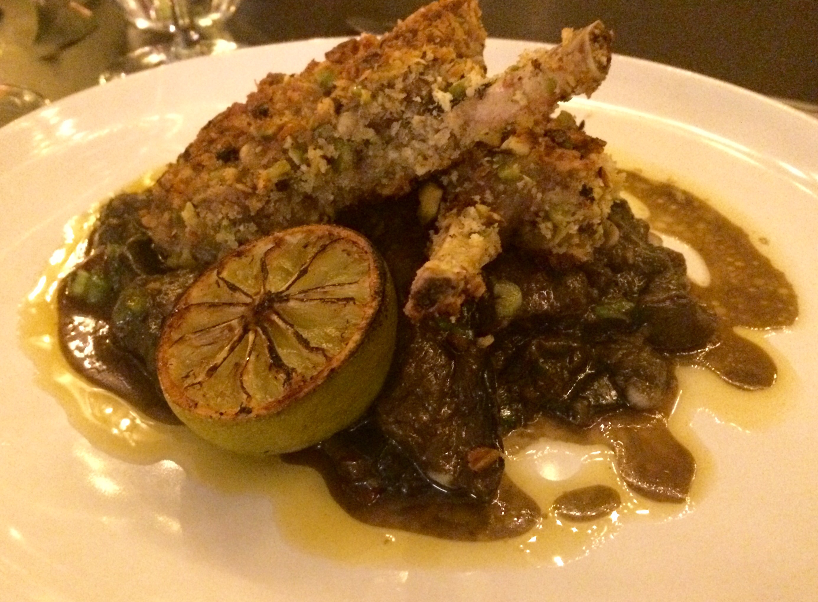 Next came a delicious lamb dish. Encrusted in pistachio nuts, the cutlets were sat on a bed of aubergine in spicy miso sauce.