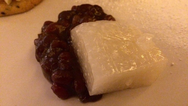 For dessert we were presented with a trio of sweets. From the left to the right we had a yuzu cheesecake biscuit which was light and refreshing, followed by a matcha green tea Yule log, then sweet adzuki beans with a sweet sake jelly.