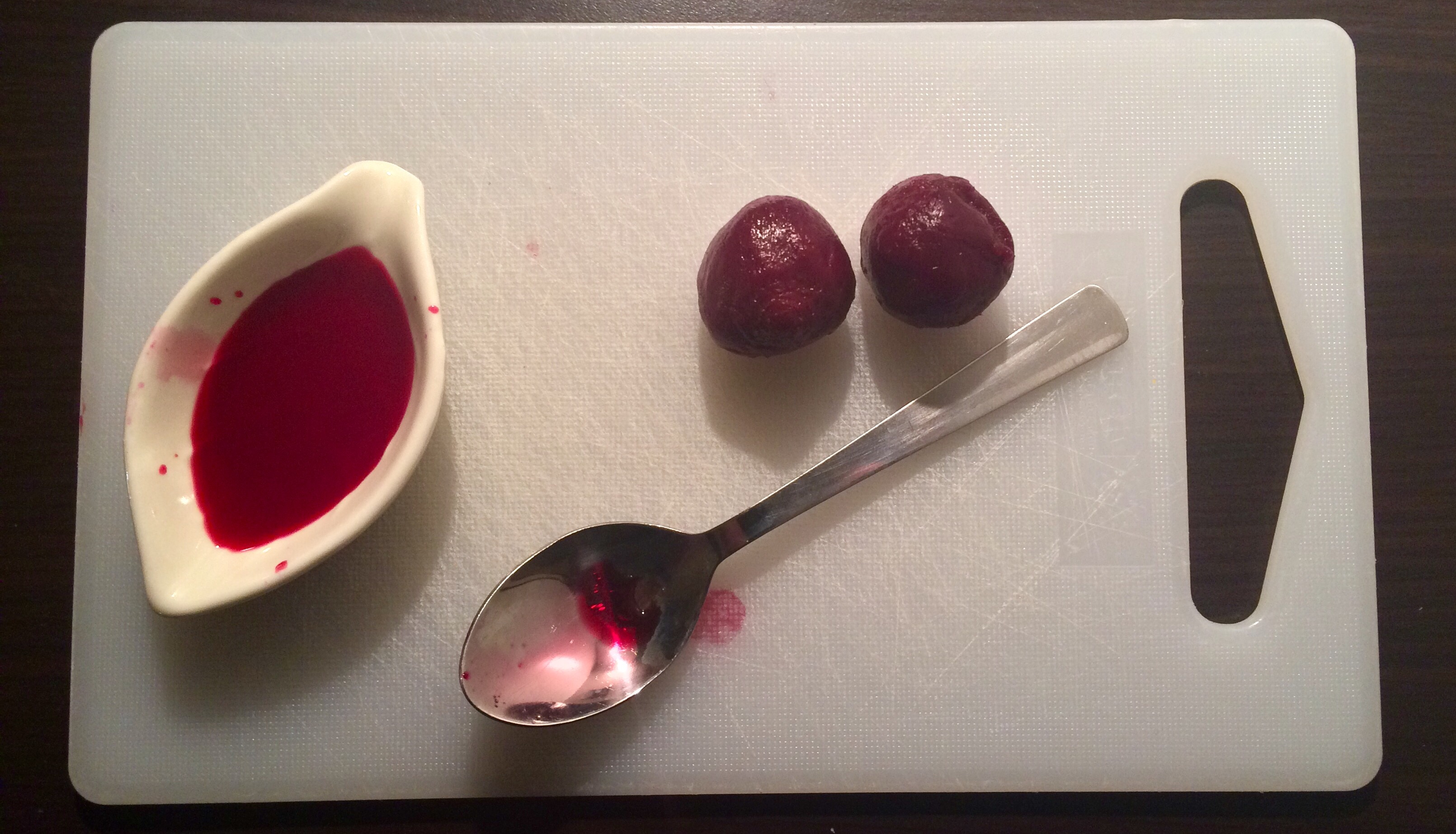 Take two small pickled baby beetroot and two teaspoons of the pickle brine (or up to 6 of you really like the vinegar flavour).