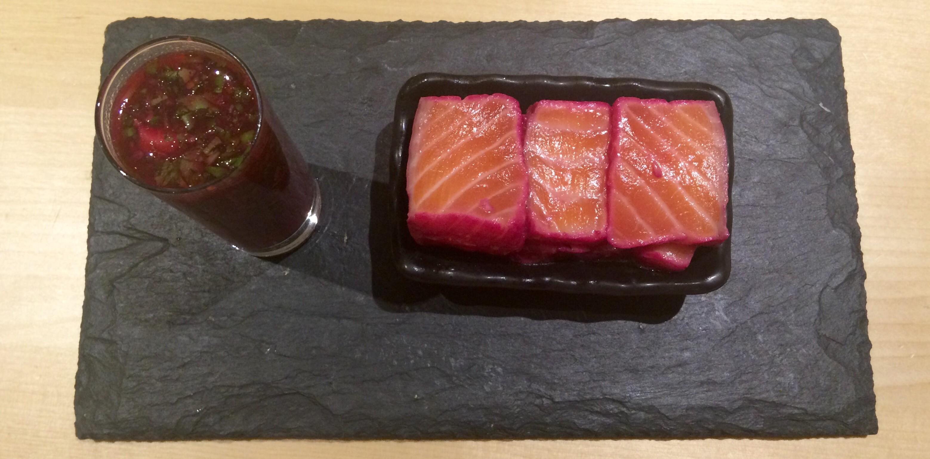 As an accompanying snack, I am a fan of things that are cured and pickled so I made a salmon ceviche using a Laura Santtini recipe but with an additional tablespoon of beetroot pickle to impart a red colour.