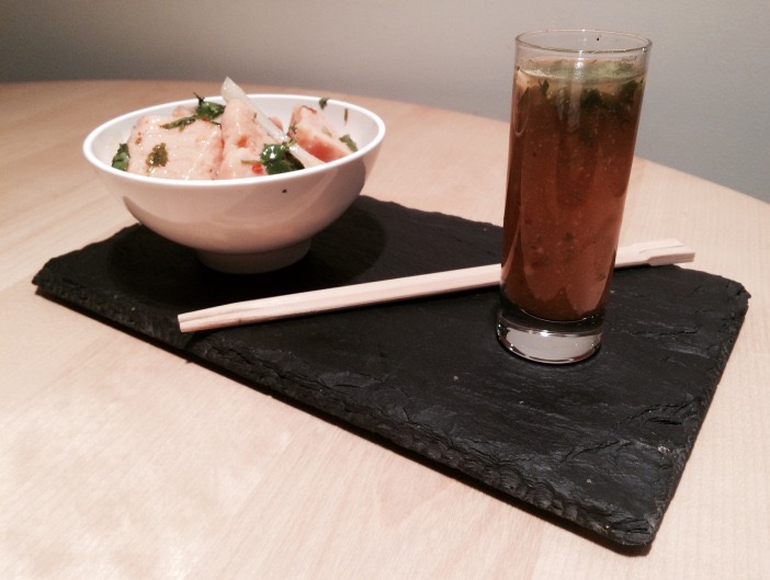 Note that I like to serve the ceviche marinade (leche de tigre) in a shot glass. Not only is it traditional Peruvian practise, it’s also tasty and, if I’m not much mistaken, very healthy (all that vitamin C from the citrus juice!).