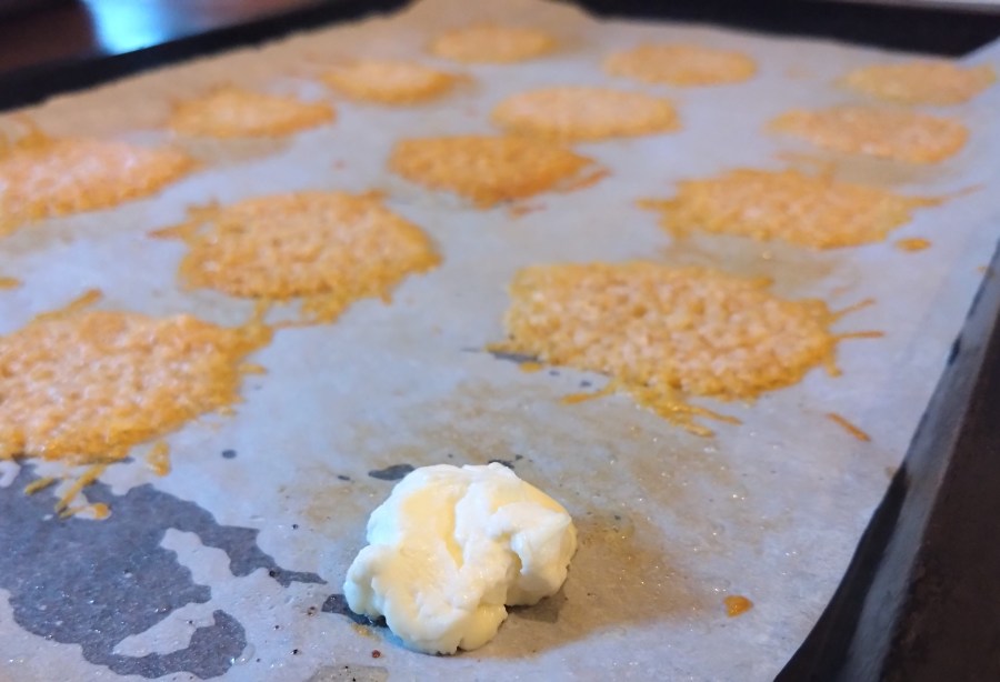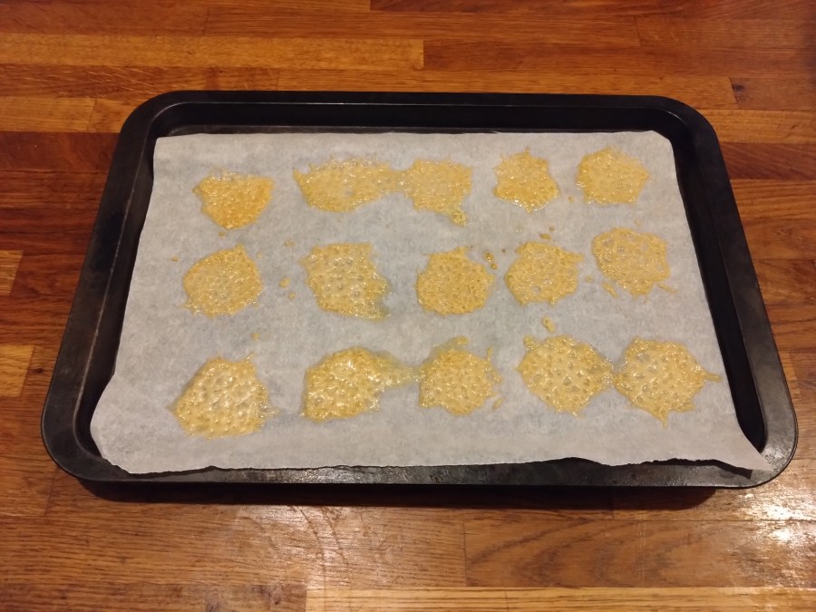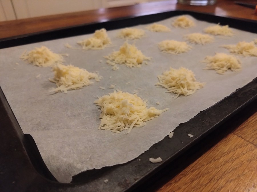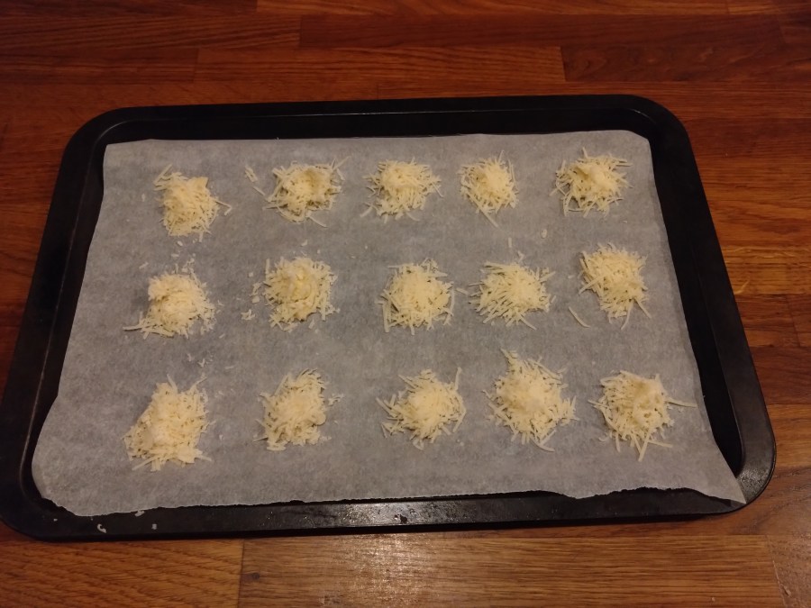 Lay some baking paper on a tray, then make little mounds of cheese, evenly spaced across it.