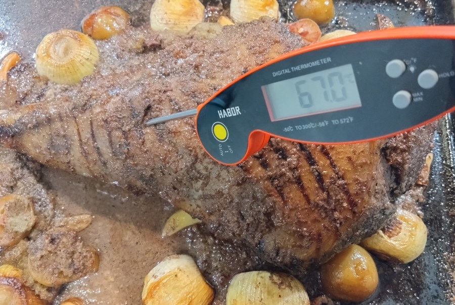 - Depending on how you want your meat, you could leave it in for longer. If you have a meat thermometer, 60°C is medium, and 70°C is well done. I normally like my meat as rare as recommended but this was for guests so I really didn’t want to be responsible for killing anyone or putting them off.