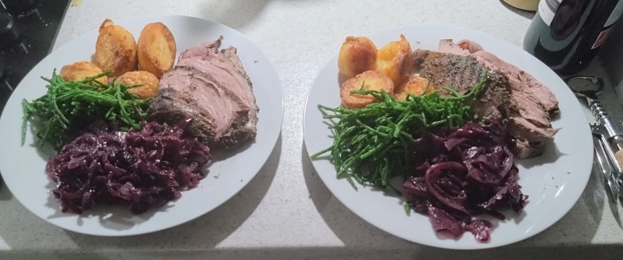 The dish is served here with roast potatoes, red cabbage and samphire prepared by my neighbour.