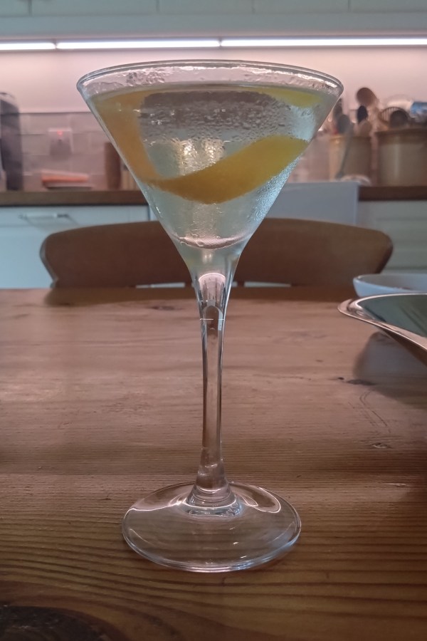 As such, I made a second martini with only a coin-sized piece of grapefruit peel which seemed ample as a complement to the drink’s flavour profile. It also works perfectly well with a garnish of lemon peel. Olives would also work but I would rather serve them on the side rather than putting too much on the already delicate flavour profile of the drink.