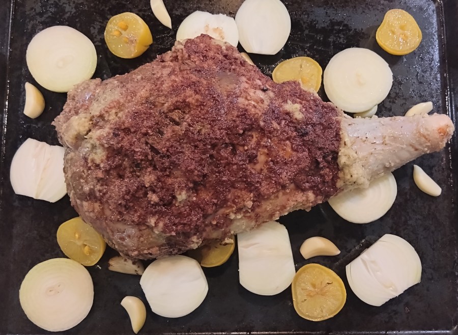 While preparing a slow cooked leg of lamb for dinner, I was adding aromatics to the pan. As well as herbs, onion and garlic, I also added some preserved lemons to give it some zesty lift.