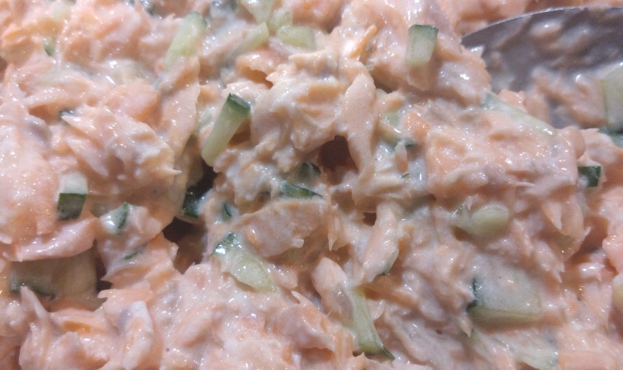 - Add the salmon and cucumber to a large bowl and stir in the mayonnaise so it’s all well mixed.