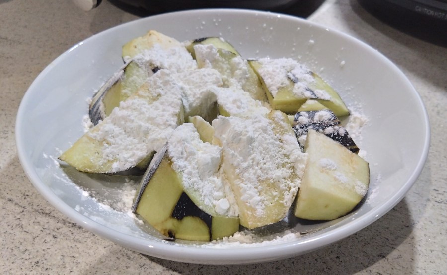 After 20 minutes drain the aubergine. You don’t need to dry it off. It’s okay for it to be damp. Toss it in cornflour until it’s well coated.