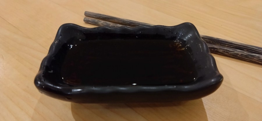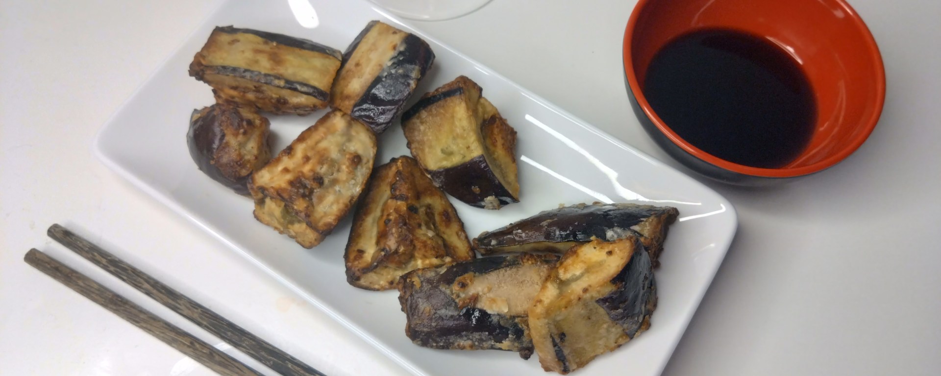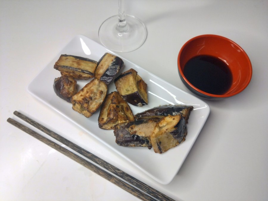 While the aubergine is cooking you might want to prepare a dipping sauce. I like a half-and-half mixture of soy sauce and balsamic vinegar. Ponzu is also very good. They both balance saltiness with acidity which goes very well with the oil and gooey crunch of the Aubergine.