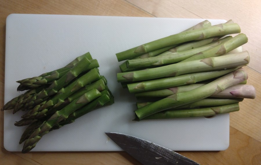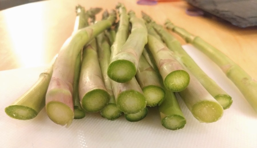 You can alternate your threading between asparagus stem and ‘point d’amour‘ (the tip) or you can have skewers that are all stem or all tip. It’s up to you.