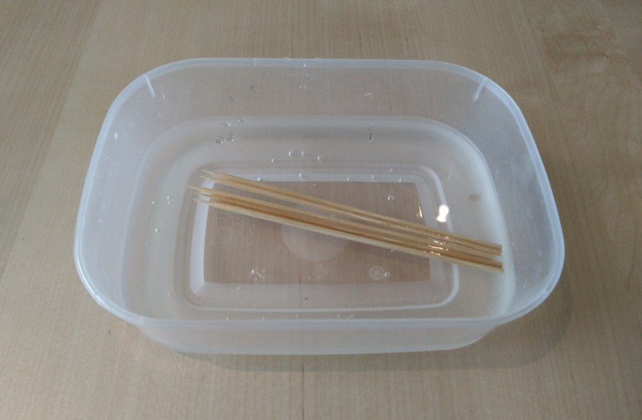 Start by soaking the skewers in water while you prepare everything else. I put them in a Tupperware container filled with water and weigh them down with a small dish that can fit into the tub.