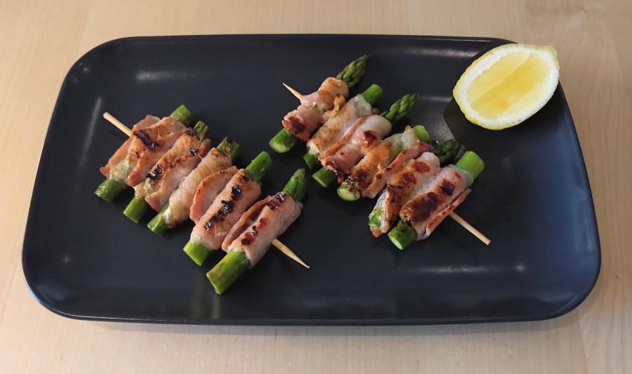 That should be all you need. The bacon should be nicely cooked and the asparagus should still be fresh and al dente. Remove from the heat at once and cook the remainder of the skewers in the same way.