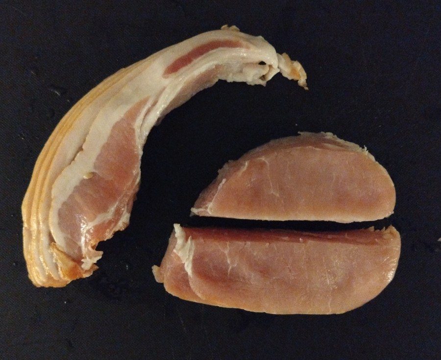 These pink, meaty slices will form the mainstay of your wrapping. The stringy-fatty bits are very tasty but use them to wrap any leftover asparagus at the end.