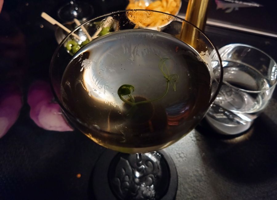 The glass was placed on my table with a sprouting grass garnish, planted in a small layer of ‘soil’ already placed in the base of the coupe. The waiter then poured the martini into the glass from a prepared jug. I normally like my martinis served fast, simple and without flourish but this was certainly an interesting spectacle to watch, especially given that the server had to make sure not to aggravate the ‘soil’ sediment and create a muddy mess.